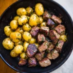 This one-pan recipe features tender steak bites and crispy potatoes, all coated in a rich garlic herb butter, perfect for cozy dinners.